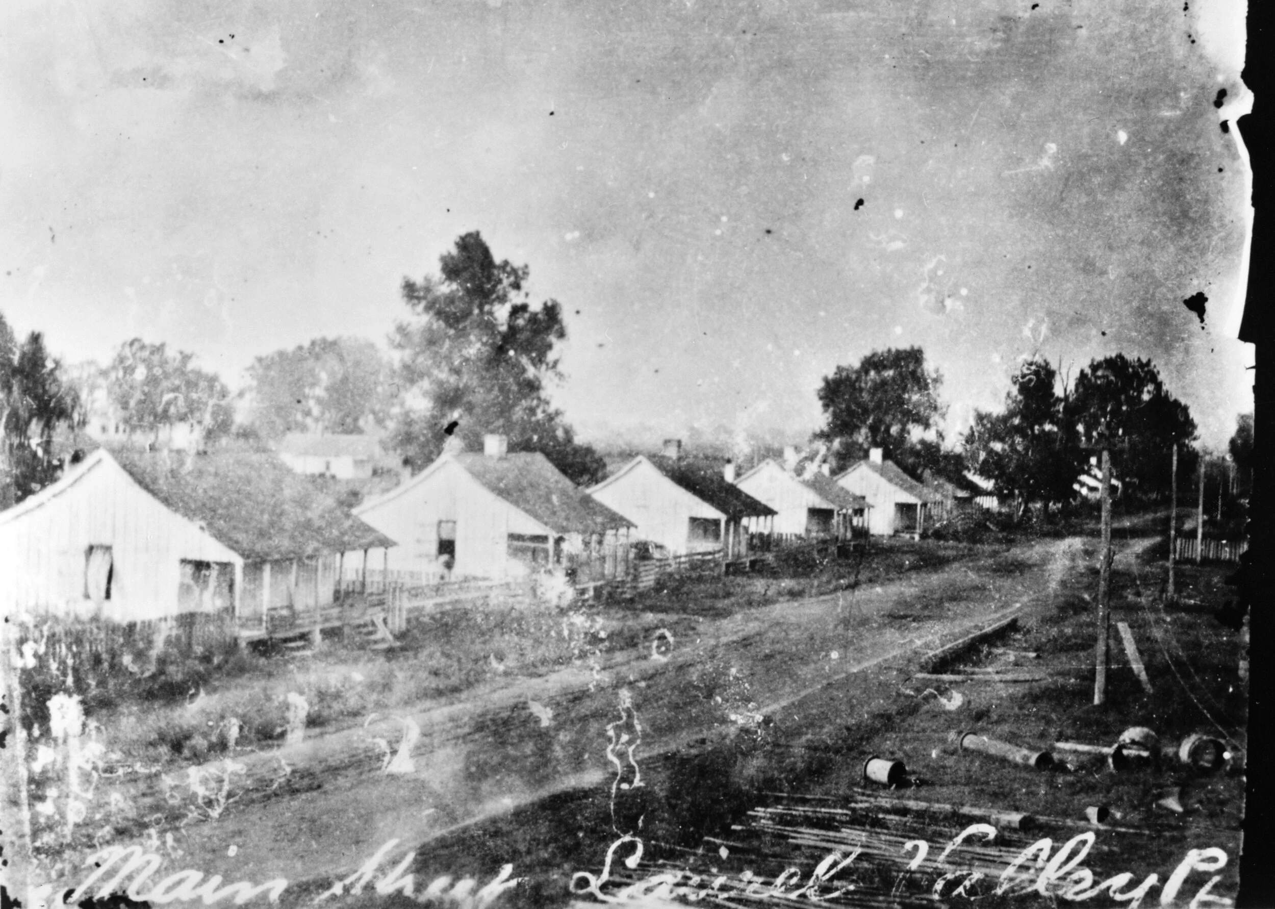 Photocopy of c. 1906 photograph of Creole cabins along Main Street through the Laurel Valley Village.